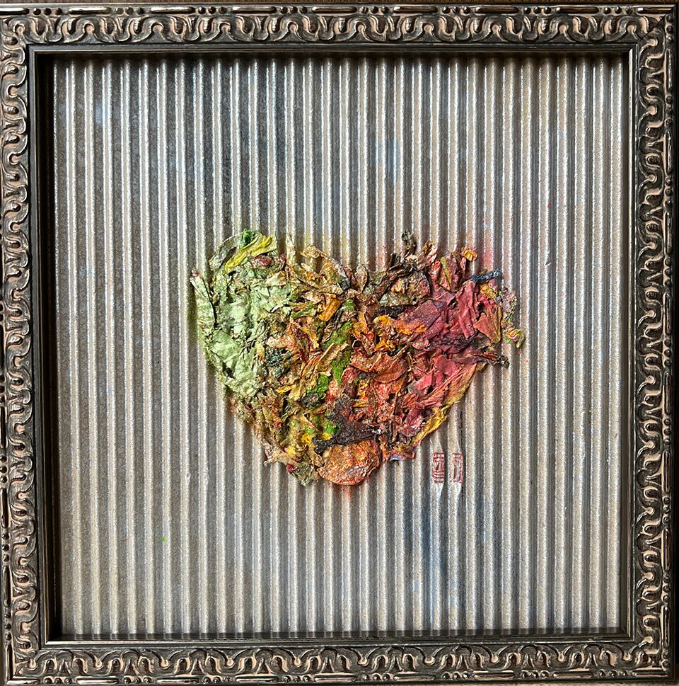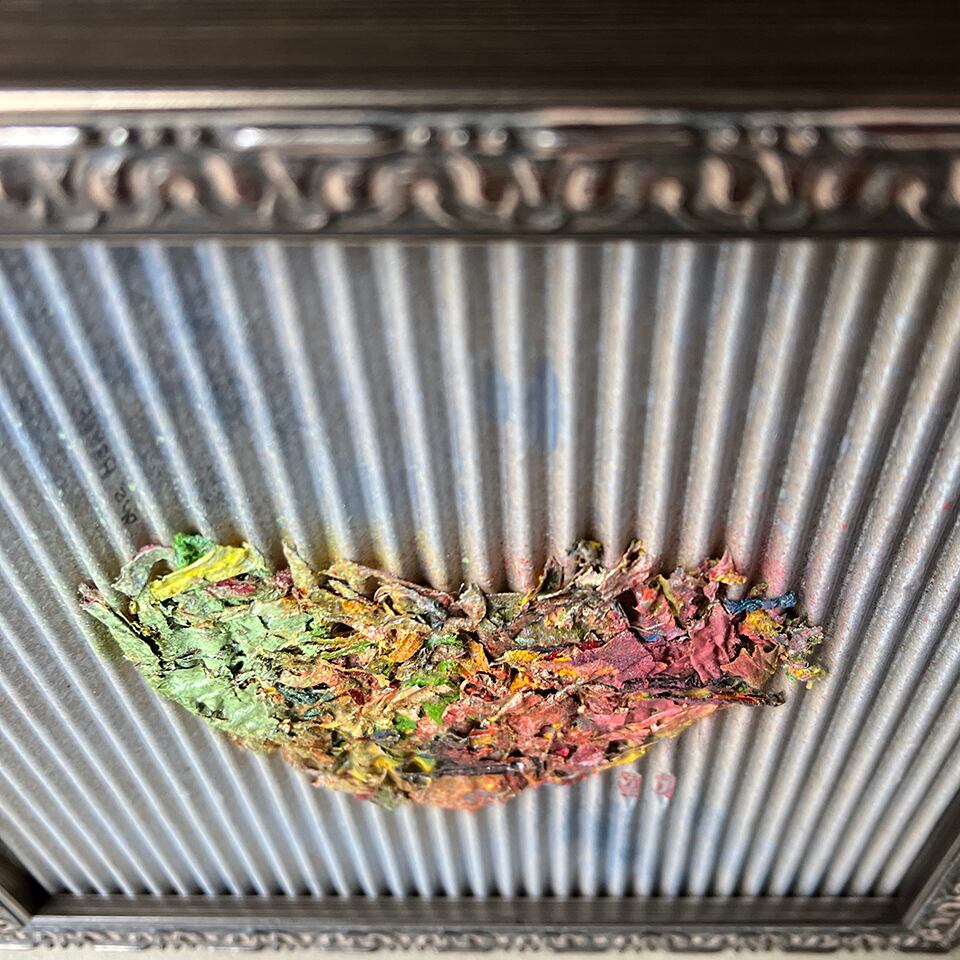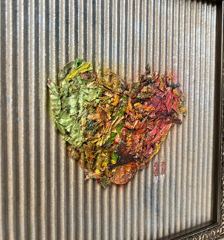 虹色に染まるティッシュのコラージュでできたハートに、なみなみダンボールで表現した空。 テーブルサイズで卓上にも、ちょっとした空間にもピッタリ。