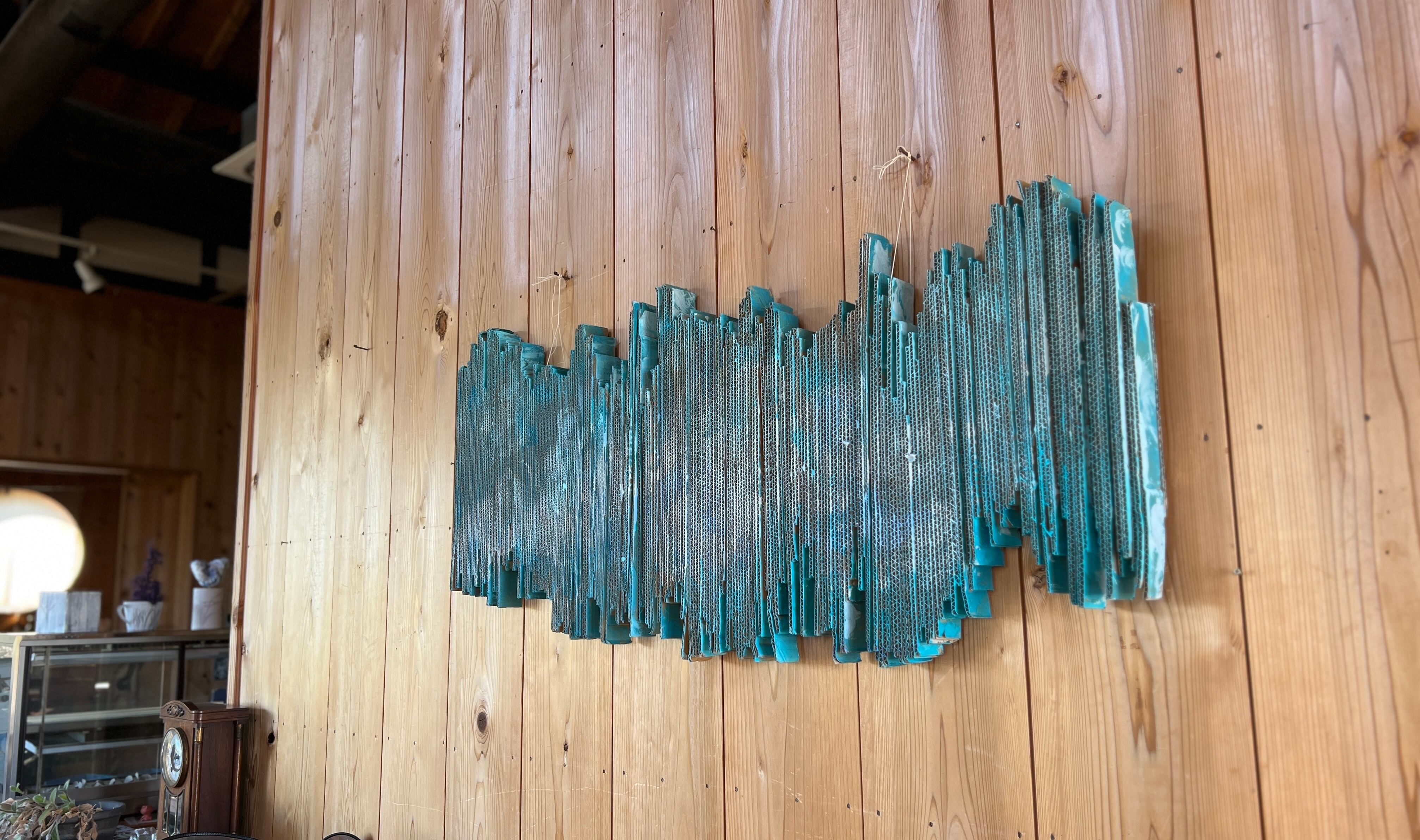 段ボールの切り出し板で仕上げた動きのあるオブジェ。お部屋の片隅に、リビングの真ん中にどんと置いて、訪れる人をびくりさせて楽しもう! サイズ:約1200x600x60mm