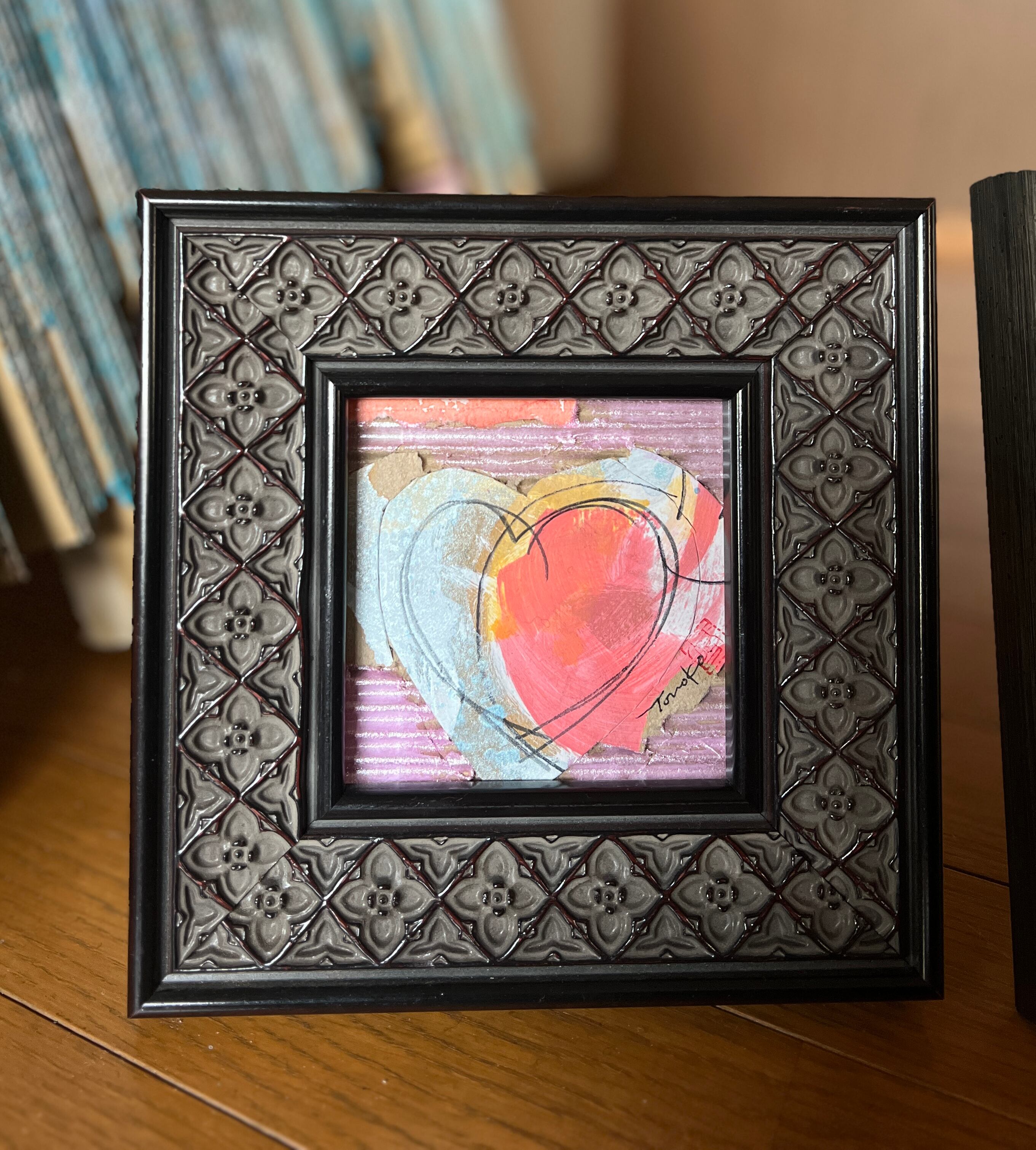 誰もが持っている、熱い心を描いてみました。あたたかい心、思いやりのある心、ワンハート。 使用素材:段ボール・アクリル他 作品サイズ:90x90mm 額サイズ:185x185x30mm