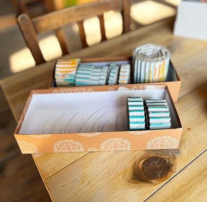 なみなみにした段ボールをくるくるまいて。たくさん飾れば楽しくなる。